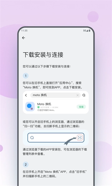 若旧手机非Moto安卓设备:安装【Moto换机App】,打开后选择“Android”选项并扫描新手机的二维码设置。