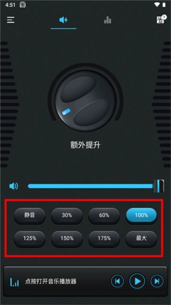 1、音量与声音增益功能:作为一款专业的音量增强工具,它可将音量提升至原有的200%,不仅设有直观的音量调节滑块,还提供30%、60%、100%及最大音量的预设按钮,让用户能快速完成音量调整。