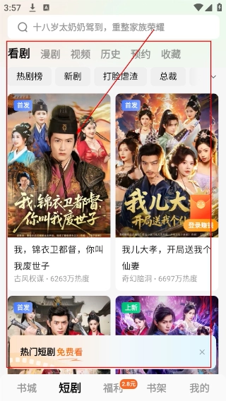 1、在书城页面点击底部的【短剧】选项,就能进入短剧专属模块,在这里可以浏览各类短剧内容,开启短剧观看流程。