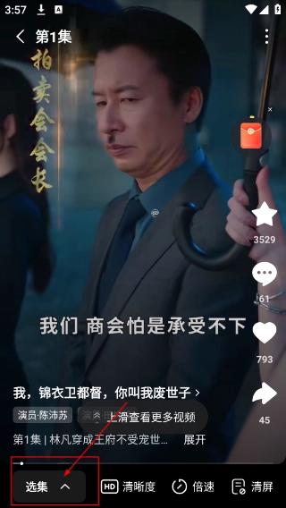 3、进入短剧播放页面后,点击【选集】按钮即可切换不同剧集,此外还能使用点赞、评论功能,并且可以调整清晰度、倍速等播放相关设置。