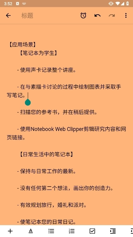 做笔记。以文本为基础,把图片、列表和音频都添加进去,并且都整合在同一条文本笔记里。
