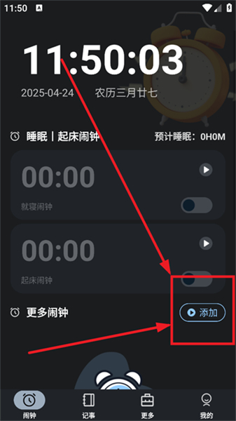 2. 轻点首页的“添加”按键,随即进入设置新闹钟的界面。