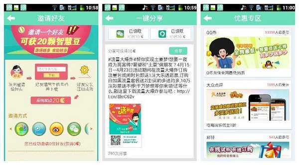 咱们再来瞧瞧其他的赚豆方法,主要分为三类。其一为邀请好友,只要成功邀请一位好友,就能获取20颗智慧豆作为奖励。所以,别再犹豫啦,赶紧拉身边的小伙伴们一起加入吧。关注、分享以及转发流量大爆炸的活动,这也是赚豆的途径之一。要是把流量大爆炸的各种活动转发到腾讯、新浪、人人网,一次就能赚到30颗智慧豆,更不用说关注流量微信、易信同样会赠送不少豆子呢。另外还有一种赚豆方式,就在它的优惠专区。这个专区就如同一个锦囊,里面包含了Q币、团购、彩铃等众多超给力的优惠。在该专区,无论是购买Q币、参与团购,还是订购彩铃,都会赠送智慧豆。回想起以前订过的那么多Q币、团购项目和彩铃,小编不禁暗自神伤:这要是能换算成智慧豆,得有多少啊!