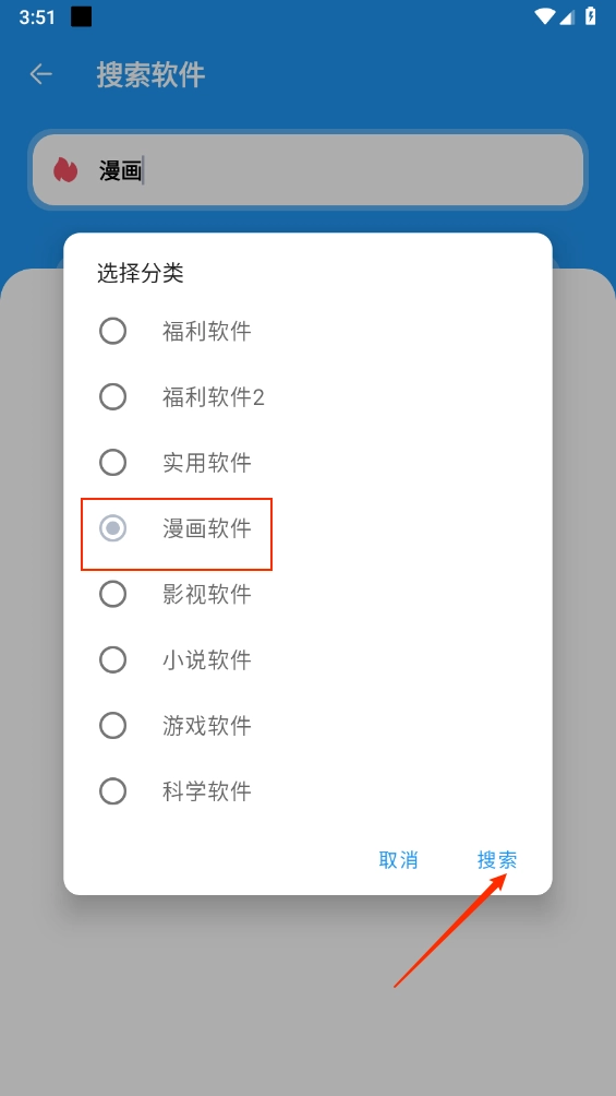 3、也能点击顶部的搜索框进行一键搜索,先选择分类,再点击“搜索”按钮。