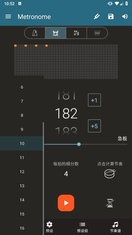 播放与停止:按下播放键开始节拍器,再次按下停止。