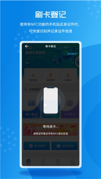 1、当使用具备NFC功能的手机靠近身份证、护照、港澳通行证、台湾通行证等证件时,能够快速识别并记录证件上的信息;