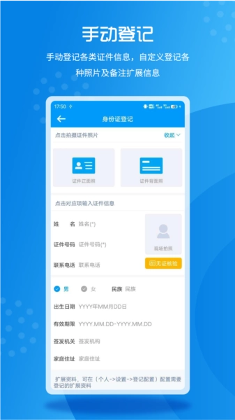 3、支持手动录入各类证件信息,可自定义添加多种照片及备注等扩展内容;