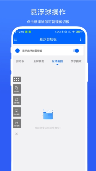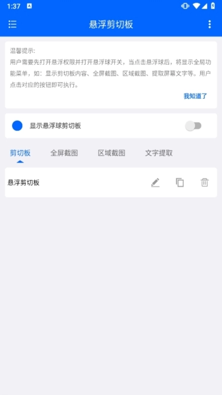悬浮剪切板是一款手机剪切板管理工具,用户只需点击悬浮球,就能把剪切板内容添加到历史列表,也能查看所有剪切板记录,需要使用时点击旁边的复制按钮即可。此外,软件还具备全屏截图、区域截图、提取屏幕文字等实用功能。如果你在手机上处理文档时,频繁需要复制粘贴文本,那么这款工具绝对值得一试。