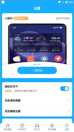 支持桌面小组件,常驻通知栏和整点播放等功能,方便快捷查看天气信息!