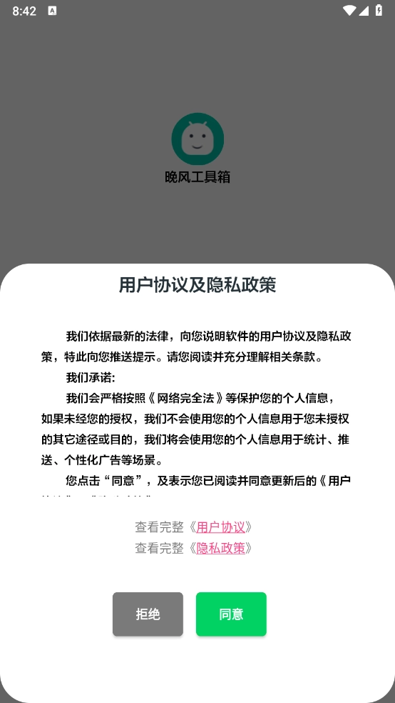 1、先在本站安装晚风工具箱,查看相关用户的协议和隐私政策。