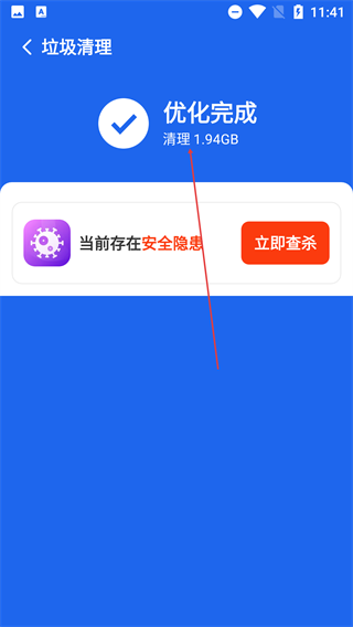4、清理结束后会出现【优化完成】的提示,您还能依据提示对检测到的安全隐患进行处理。