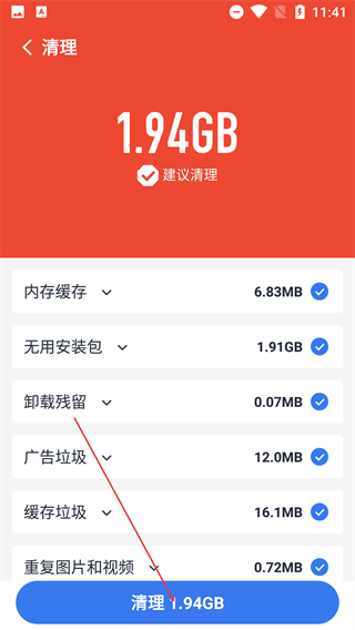 3、授权完成后,系统会检测出待清理的垃圾文件(例如1.94GB),在确认已勾选需要清理的项目后,点击【清理1.94GB】按钮即可执行清理操作。