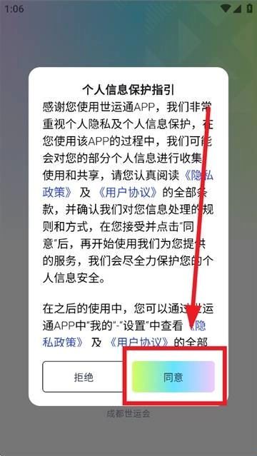 1、打开世运通,请仔细阅读并同意个人信息保护指引。