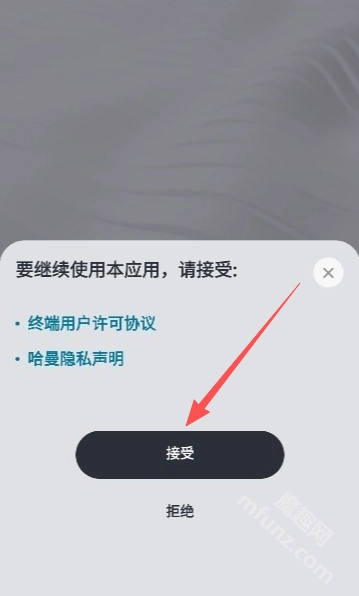 1、打开harman kardon one软件并点击接受