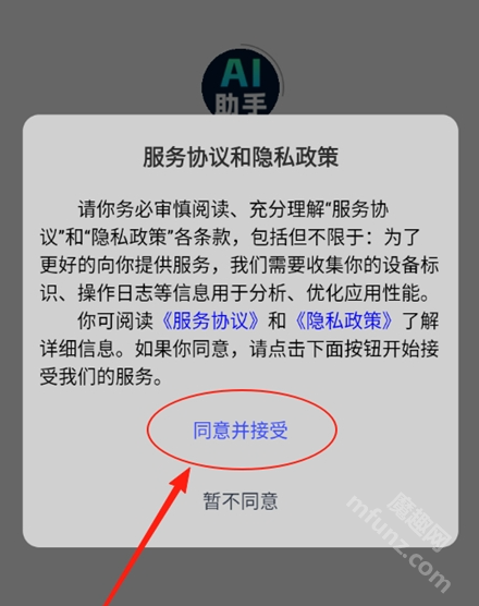 1、打开全能AI助手点击同意并接受