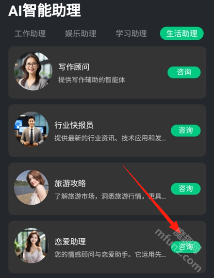 4、点击“助理”选项,挑选一个你偏好的助理类型,点击“咨询”按钮即可开启聊天