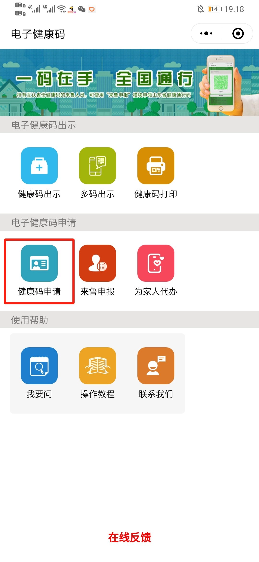 方式一:打开“爱山东”,在首页找到“健康通行码”入口,登录并填写相关信息后点击“健康码申请”即可完成(首次来鲁人员请先选择“来鲁申报”);