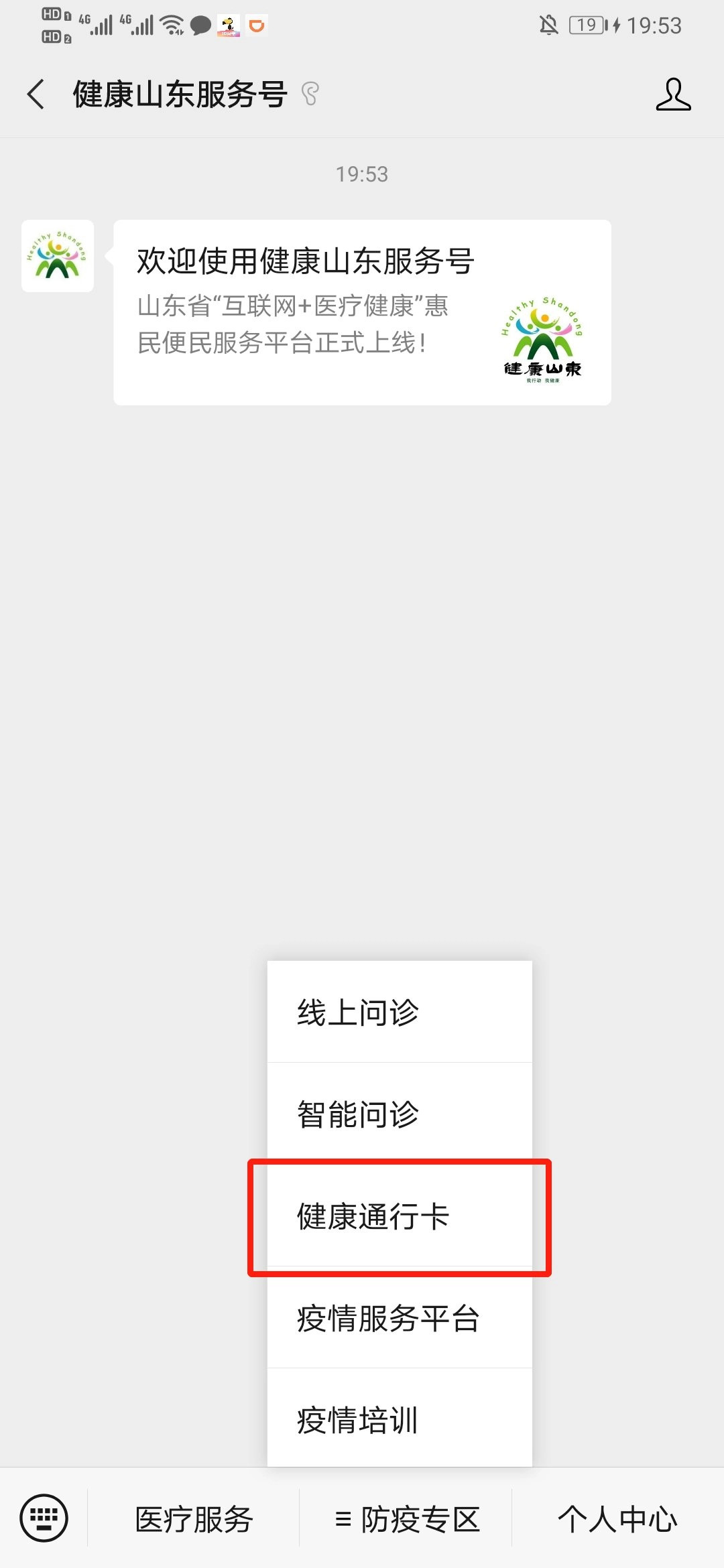 方式三:关注微信公众号“健康山东服务号”,在菜单栏中选择“防疫专区”—“健康通行卡”即可开始申请流程。