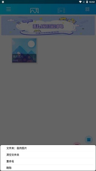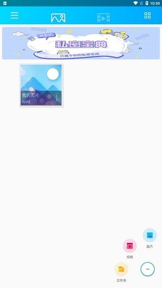 完成上述设置后即可正式启用该功能,界面如图所示,这里设有图片与视频的私密添加选项。点击下方的“+”号按钮,就能选择需要添加的照片或视频,而文件夹功能支持自定义图片分类的名称。