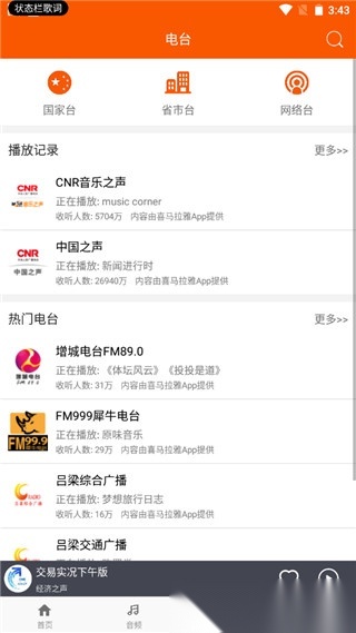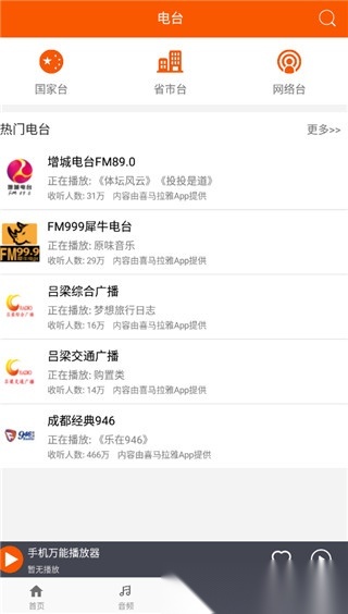 2.点击“电台”选项,这里汇聚了国家台、省市台、网络台等各类电台资源,用户可根据喜好自由收听。