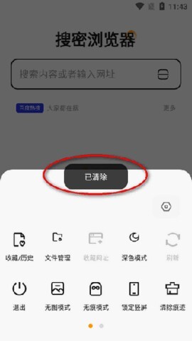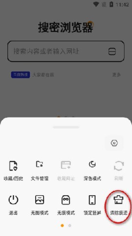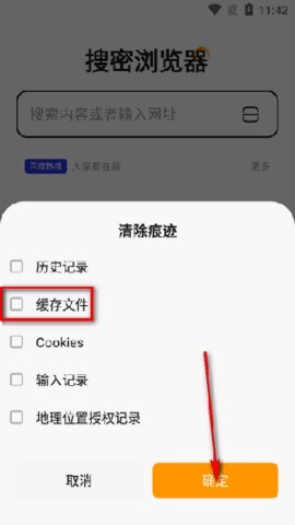 答:启动搜密浏览器后,点击右下角的按钮进入功能界面,选择“清除痕迹”选项,接着勾选“缓存文件”并点击确定按钮,就能完成缓存清理操作。