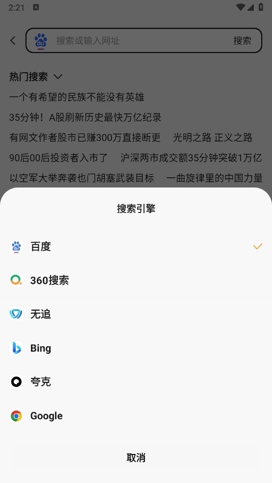 2、初始默认的浏览器为百度浏览器,在弹出的页面里挑选想要更换的浏览器即可,目前支持的浏览器包括必应、360、搜狗、夸克等。