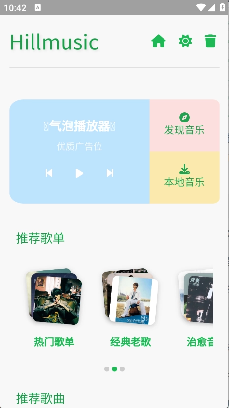 Hillmusic,让你能随时随地进入听歌状态,这里汇聚了各类经典老歌与流行音乐,支持创建专属歌单,还会依据用户的喜好智能精准地推荐同类型音乐资源,并且提供高清流畅的播放音效,带来更优质的听歌体验。