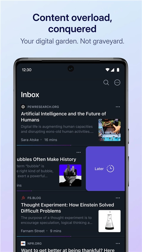 1,稍后阅读:保存文章到Reader,在无干扰环境中进行阅读体验。