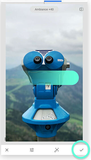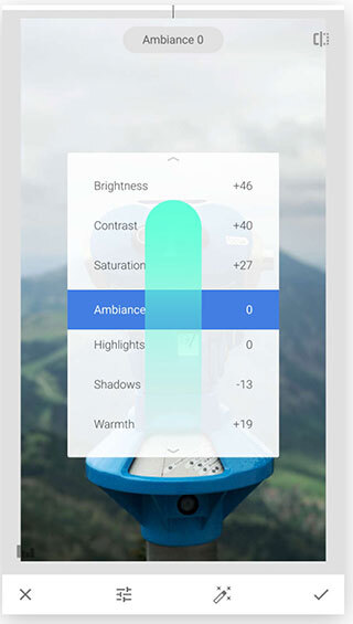 Snapseed 里的多数调整功能都是这么操作的:在图像区域垂直滑动来选定参数,接着水平滑动就能调整参数的数值。