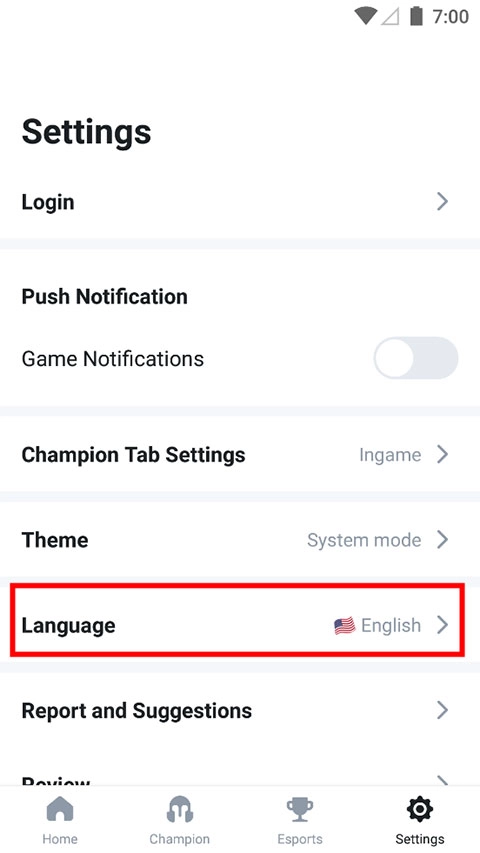 1、打开opgg手机版,在settings设置页面选择“language”。