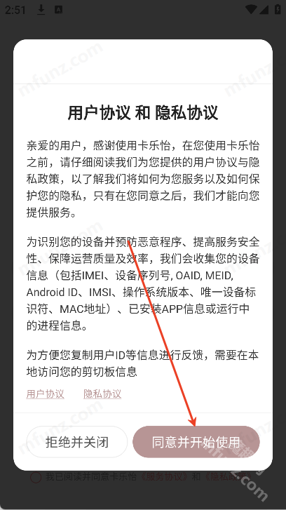 1、打开手机上的卡乐怡点击同意并开始使用
