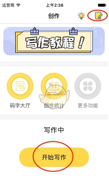 1、在全民写小说平台,点击红色椭圆圈标注的按钮,即可进入新建书籍的界面。