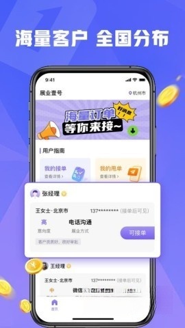 1、提供在线展业服务,用户可随时便捷地抢单获客。