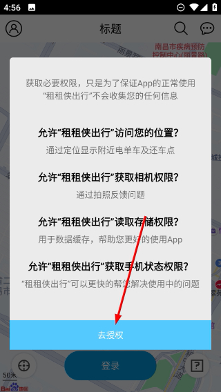 2、当权限提示弹窗出现时,点击【去授权】按钮,完成位置、相机、存储、手机状态等必要权限的授予操作。