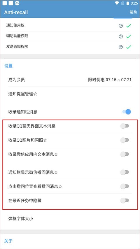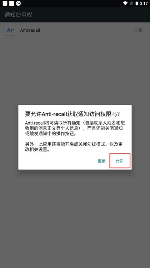 3、找到Anti-recall并点击其右侧的按钮,此时会弹出是否允许获取权限的提示,点击“允许”即可。