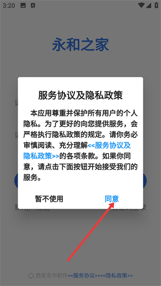 当弹出【服务协议及隐私政策】窗口时,点击窗口中的【同意】按钮,就能继续进入应用的后续页面了。