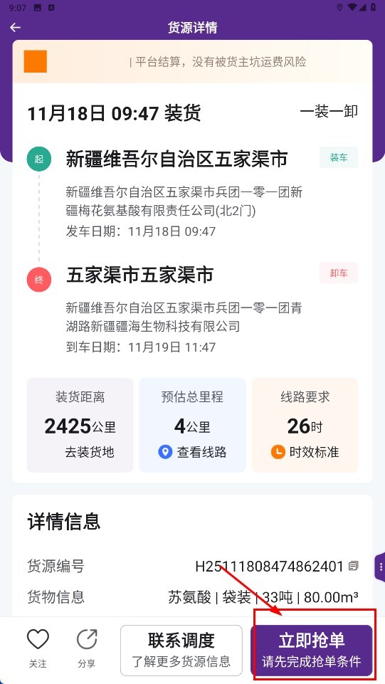 3、进入货源详情页面后,能够查看装货与卸货的时间、具体地点、运输里程等相关信息,若要进行抢单操作,需先满足抢单条件,之后点击【立即抢单】功能按钮即可。