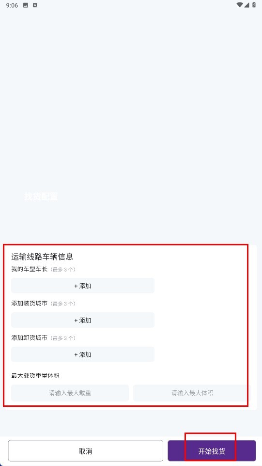 1、进入找货配置页面后,填写【运输线路车辆信息】相关内容,涵盖车型、装货与卸货城市、最大载重及体积等信息,随后点击【开始找货】功能按钮。