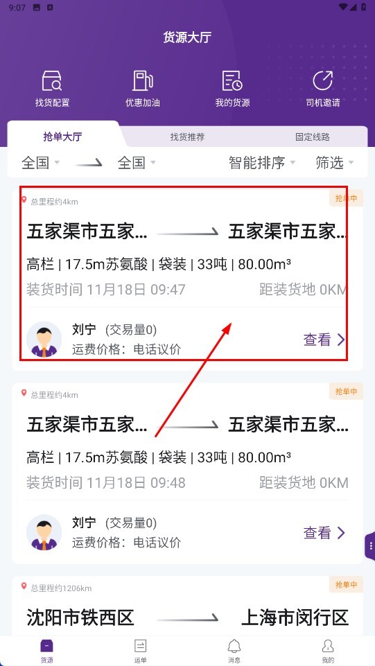 2、进入货源大厅后,找到自己感兴趣的货源卡片(例如【五家渠市-货源卡片】)并点击,即可查看该货源的详细信息。