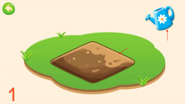 3、点击数字1后,左下角会出现一个数字1的标识,右上方有一个水壶,中间则是一块土地,接下来请把水壶里的水倾倒在土地上。