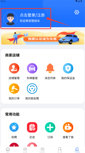 1、打开慧拍车应用,找到登录或注册的入口并点击,接着完成账户验证的相关流程。