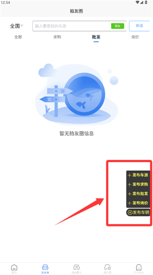 3、进入我的拍友圈页面,在这里发布车源信息或者提交求购需求。