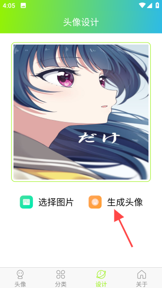 4、进入【设计】界面后,点击【选择图片】按钮导入所需图片,再点击【生成头像】按钮即可完成头像制作。