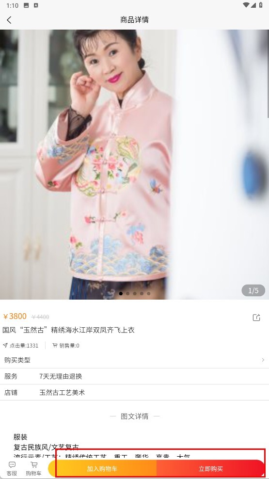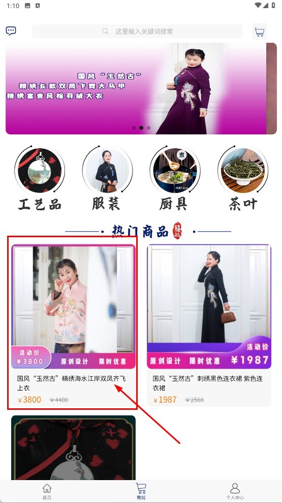 2、在商城页面挑选自己感兴趣的热门商品,比如国风系列的“玉然古”精绣海水江岸双凤齐飞上衣,点击该商品即可进入详情页面。