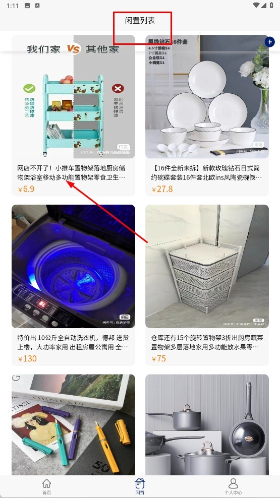 4、进入闲置列表页面,可浏览各类闲置商品。