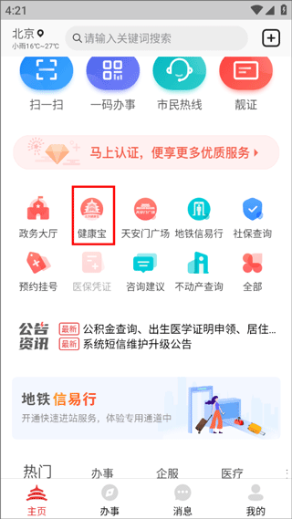 1、打开北京健康宝应用,点击页面底部的“我的”选项,进入后查看身份认证相关内容