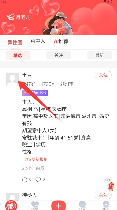4、进入首页后,浏览系统推荐的用户资料,点击感兴趣的用户头像就能发起聊天交流。