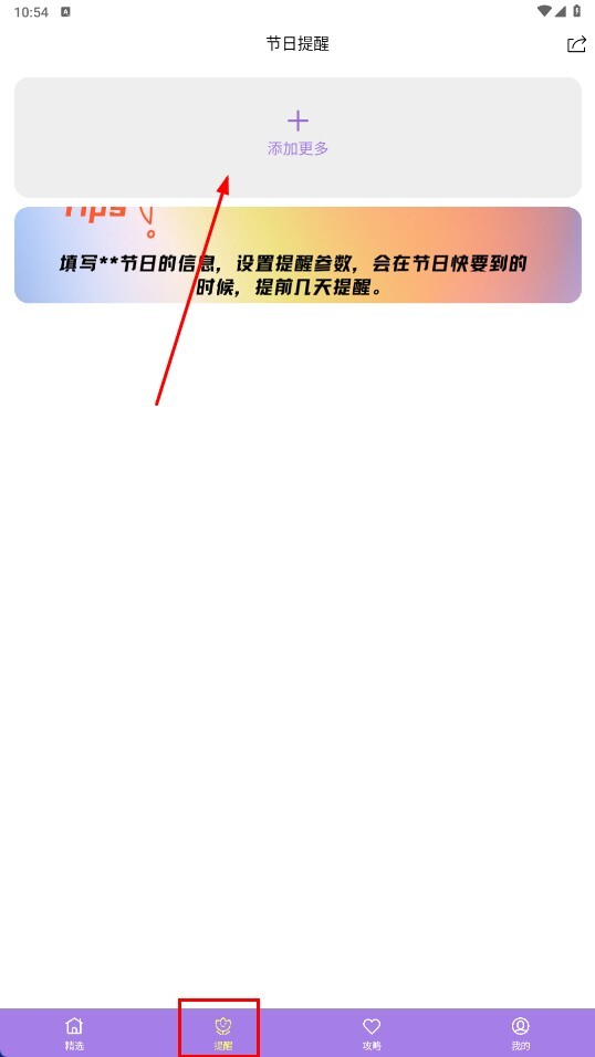 3、切换到“提醒”页面,点击【添加更多】按钮,即可进入节日提醒的配置流程。