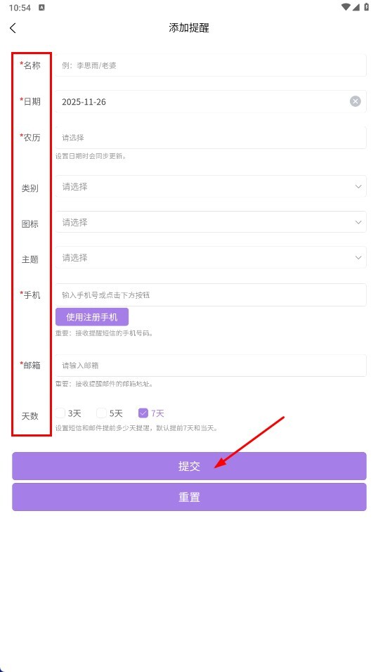 4、进入“添加提醒”页面后,填写名称、日期、手机等必填项信息,选定提前提醒的天数,再点击【提交】按钮,即可完成节日提醒的设置。
