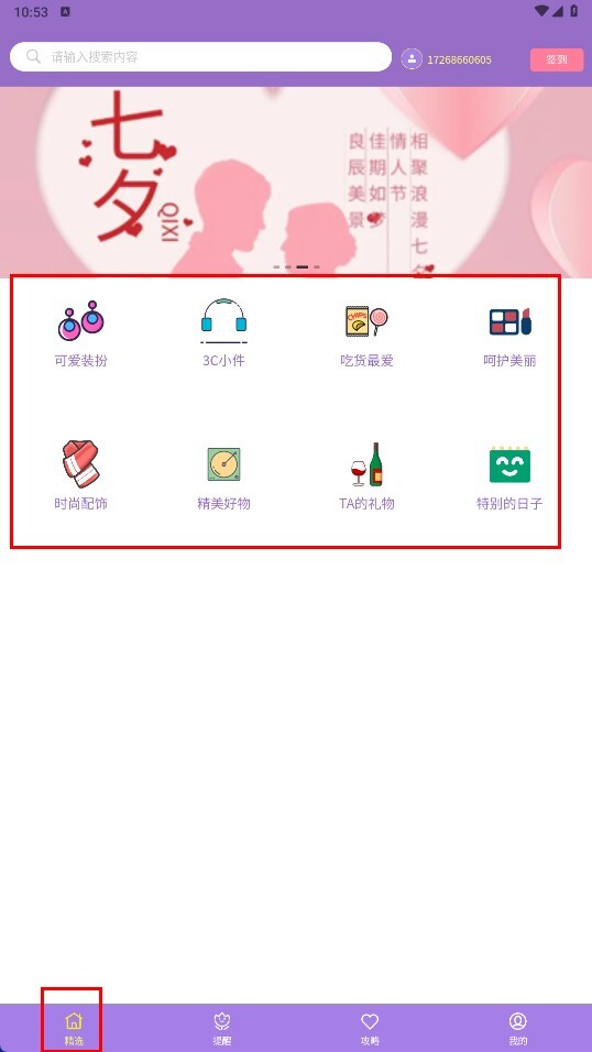 2、进入“精选”页面后,挑选合适的分类(例如“可爱装扮”“3C小件”等),即可得到相应类型的礼物推荐。
